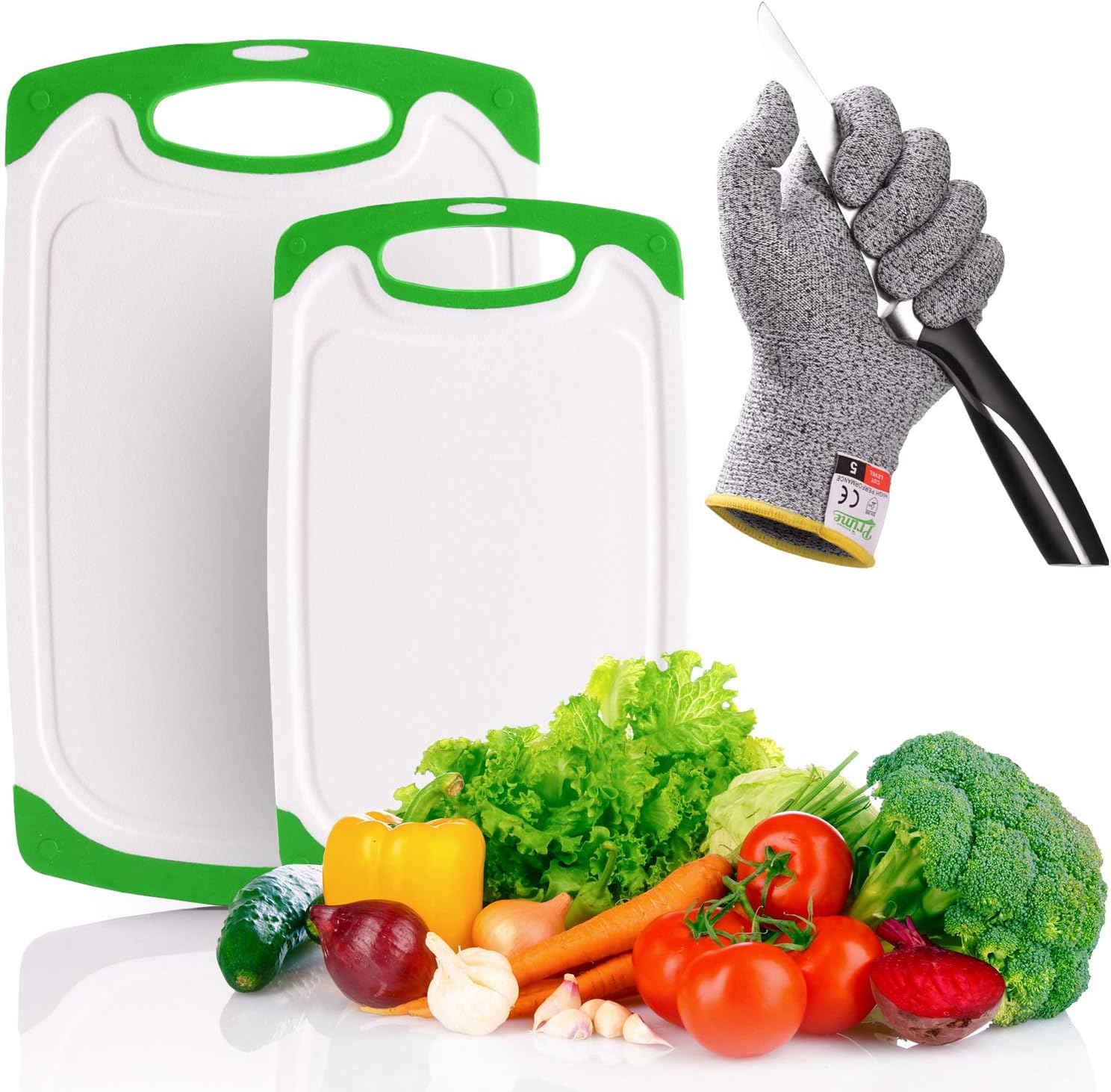 Free Shipping ๐Ÿ›’ Prime Kitchen Set of 2 Plastic Cutting Board | with 1 Cut Resistant Glove. Chopping Board BPA free, Deep Juice Grooves, Non-porous, Easy Grip Handle, Non-Slip, Dishwasher Safe.(Green)